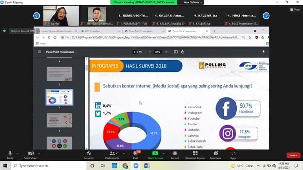 Di materi yang disampaikan Prita, Peserta juga belajar tentang bagaimana praktek mengembangkan produk melalui Facebook, Instagram, Whatsapp dan Youtube. Belajar tentang bagaimana memasarkan produk melalui aplikasi sosial media tersebut sehingga mampu meningkatkan penjualan produk pangan lokal di daerah mereka agar mampu dikenal lebih luas lagi pasarnya.