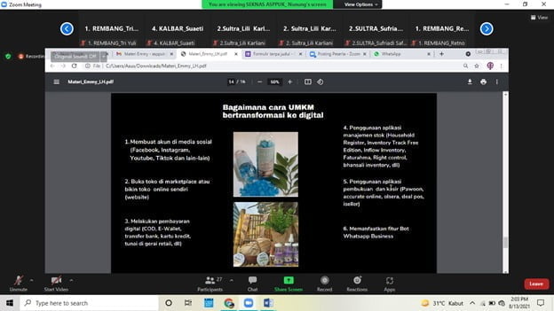 Hari pertama peserta juga mendapatkan materi dari Direktur Eksekutif ASPPUK Emmy Astuti tentang “Peran dan fungsi E-Market dalam mendukung produk lokal”. Dalam pemaparannya Emmy menyebut bahwa selama pandemi banyak pelaku UMKM akhirnya menyadari bahwa di dalam kondisi seperti saat ini, suka-tidak suka mau tidak mau pelaku  UMKM harus bisa mulai beradaptasi berjualan melalui pemasaran elektronik atau e marketing. “Meski pandemi telah berakhir sepertinya penjualan online tetap akan makin IN karena di zaman sekarang ini semua hal serba digital, semua dilakukan secara online dan makin meluas dan kita sebagai pelaku UMKM harus cakap digital untuk mengambil peluang tersebut dengan cara terus belajar menggunakan gadget pintar, belajar menguasai platform E-commerce yang sudah menjamur, ikut pelatihan jika ada kesempatannya” ungkap Emmy.