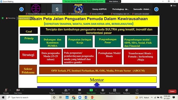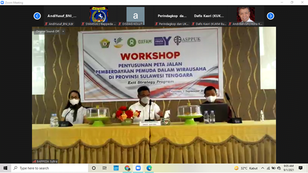 Dalam rangka diseminasi garis besar capaian serta praktek baik dari program Empower Youth for Work (EYW) kepada stakeholders kunci sehingga dapat memberi inspirasi untuk menemukan peta jalan pemberdayaan pemuda dalam wirausaha di SULTRA. Asosiasi Pendamping Perempuan Usaha Kecil Mikro (ASPPUK) atas dukungan yang didanai OXFAM Indonesia dalam Program Empower Youth for Work (EYW) pada hari Rabu, 1 September 2021, menggelar Workshop Penyusunan Peta Jalan Pemberdayaan Pemuda Dalam Wirausaha Di Sulawesi Tenggara (Exit Strategy Program) secara semi virtual (Offline dan Online).