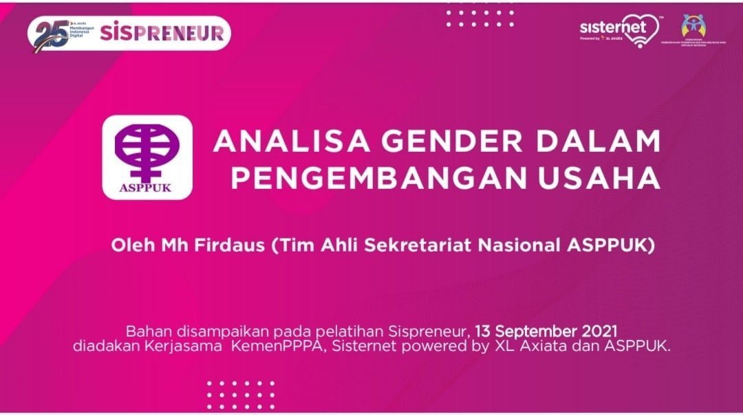 Hadir sebagai salah satu narasumber dalam kegiatan Sispreneur ini Direktur Eksekutif ASPPUK Emmy Astuti d yang memberikan materi terkait ‘Kewirarausahaan Berpersepektif Gender’ dan Staf Ahli ASPPUK MH Firdaus yang membawakan materi Analisa Gender dalam Pengembangan Usaha. Materi tersebut diberikan kepada peserta di hari pertama kegiatan ini pada 13 September 2021.